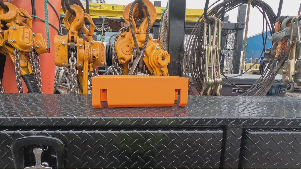 - Provides a dedicated work space right on the bucket lip. Presents workers from engaging in the unsafe practice of balancing hardware on the bucket lip.