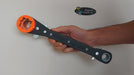 This lineman ratchet wrench includes 3/4", 1", and 1-1/8" square sizes along with 9/16″ and 3/4″ hex, allowing quick adaptation to various hardware. A bolt-thru design supports any bolt length, and the plated finish resists corrosion in field conditions. At 12-1/4″ long with a wide 13/16″ handle, this tool improves torque and handling across a broad range of applications.